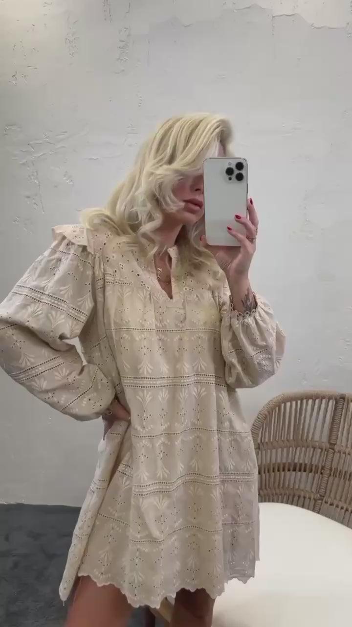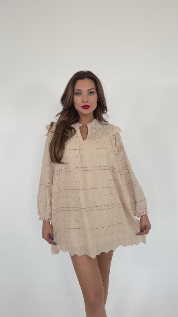 Langärmliges Mini-Hängerkleid Mit Mandarinkragen Und Lochstickerei In Beige