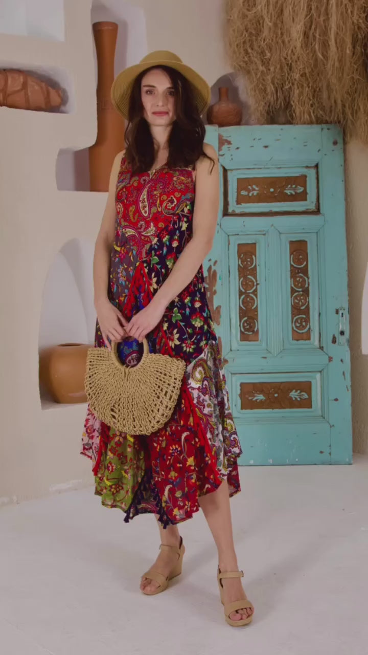 Ärmelloses Voile-Patchwork-Maxikleid mit Quastendetails