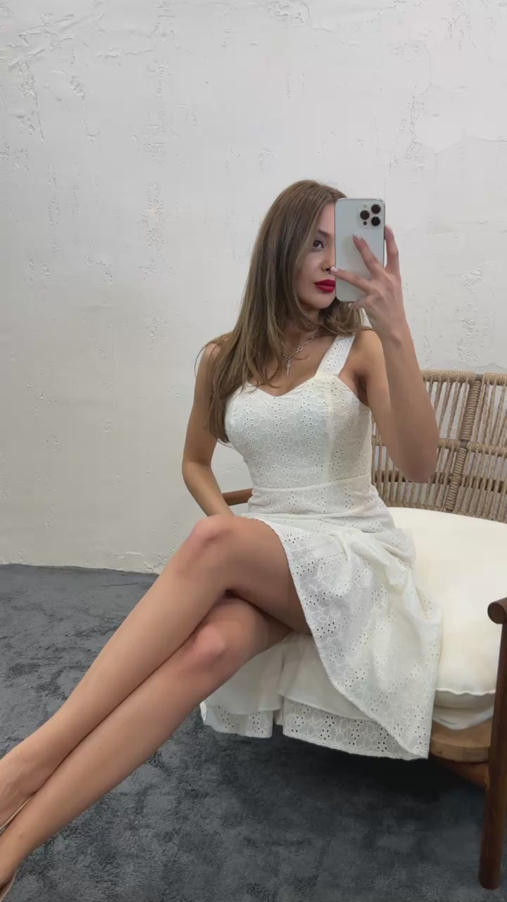 Midikleid Mit Herzausschnitt, Riemchen Und Lochstickerei In Weiß