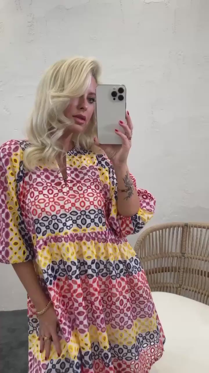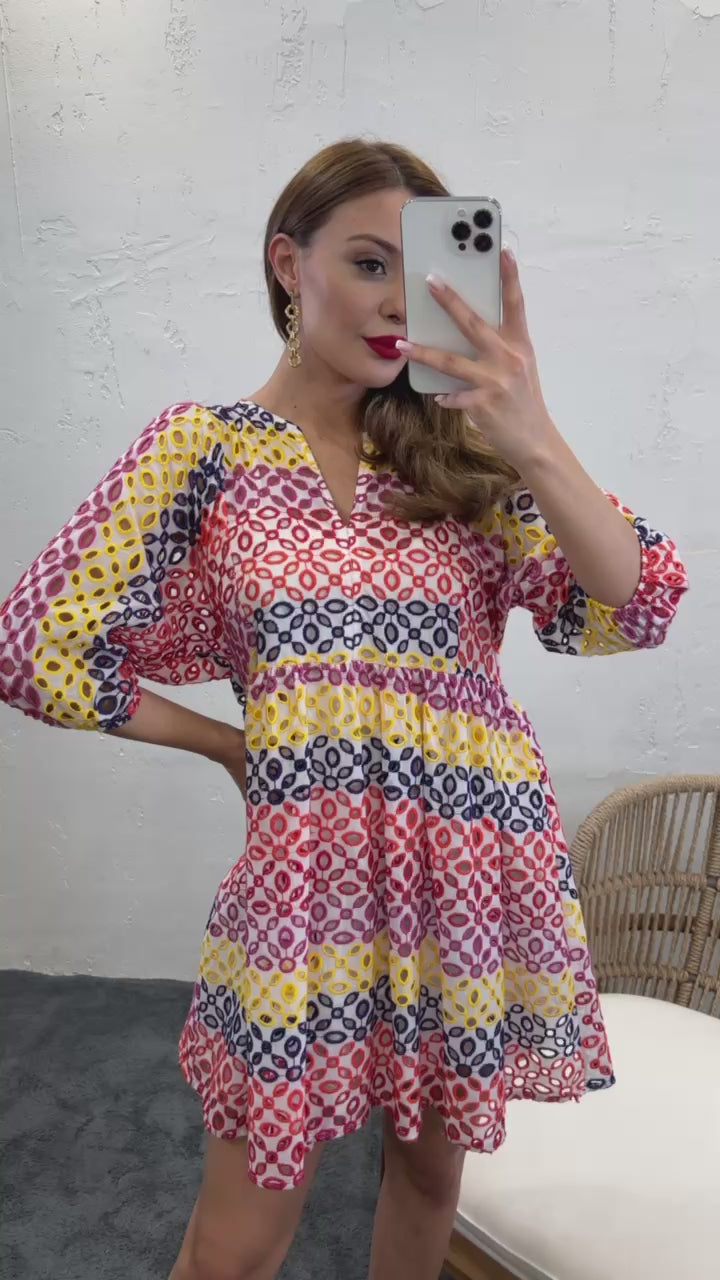 Mini-Hängerkleid mit V-Ausschnitt, Puffärmeln und Lochstickerei in mehreren Farben