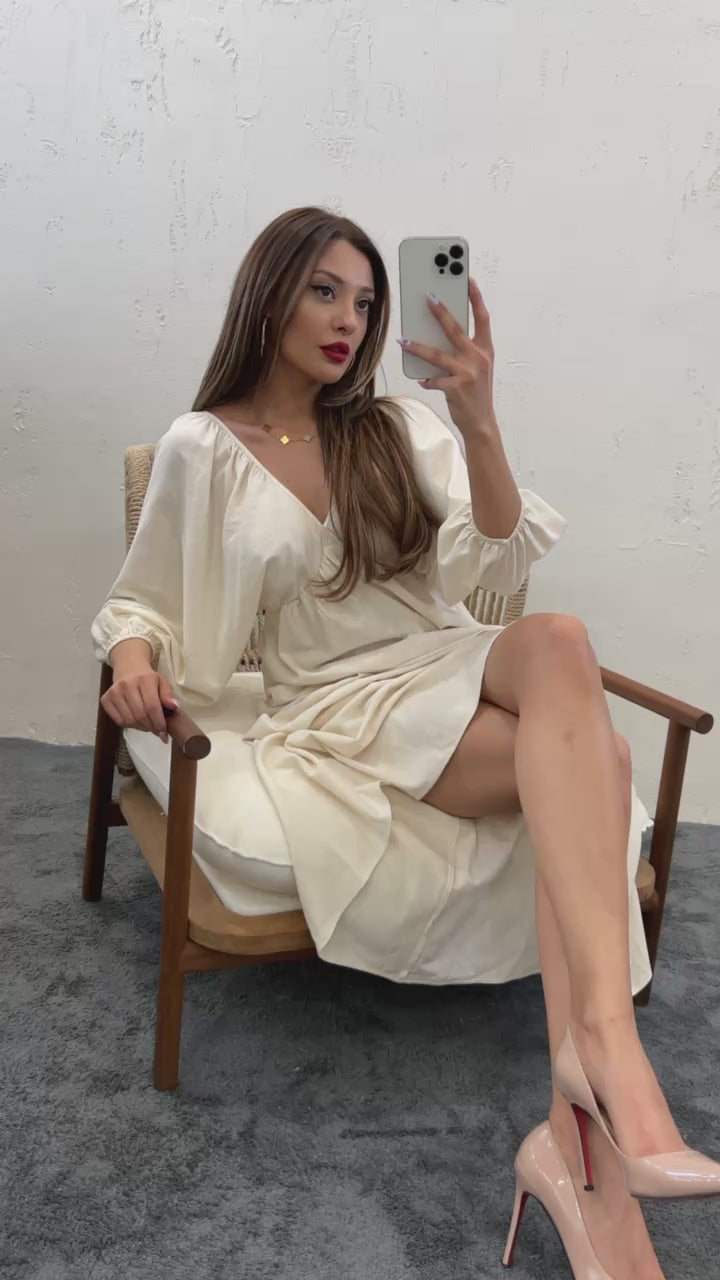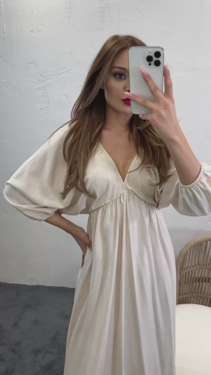 Robe mi-longue en lin à manches chauve-souris et col en V, dos nu, beige naturel