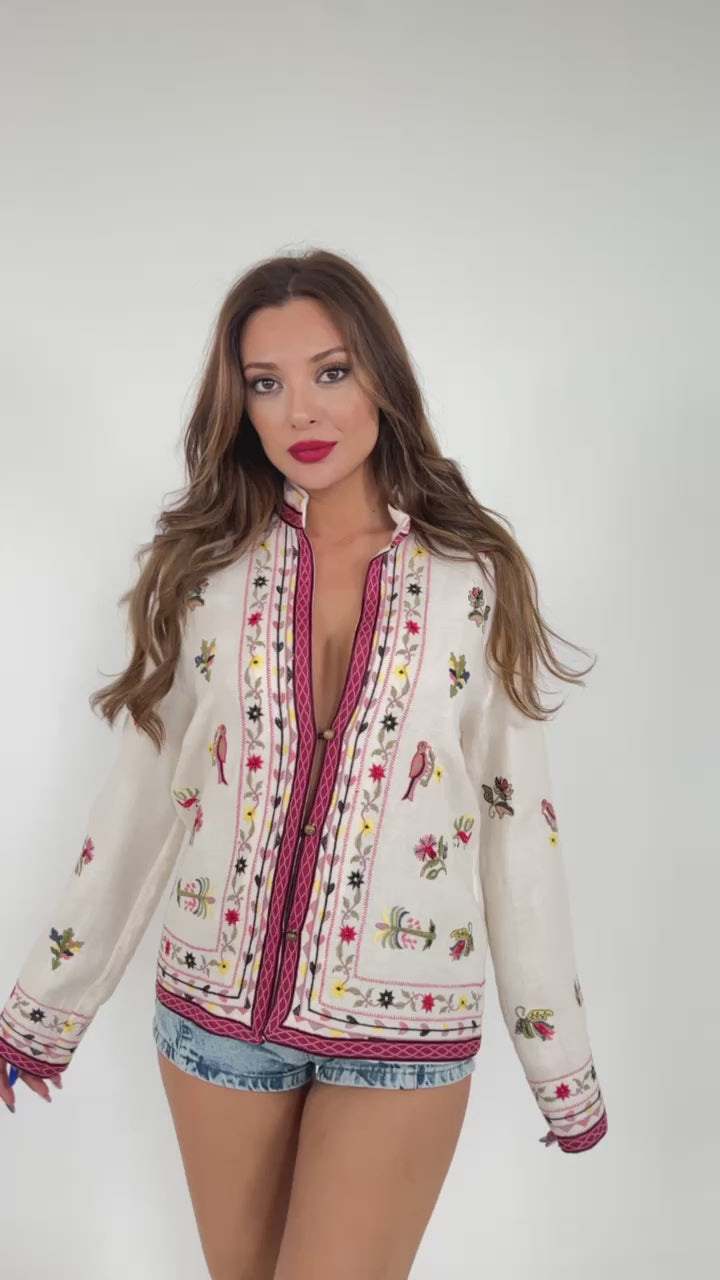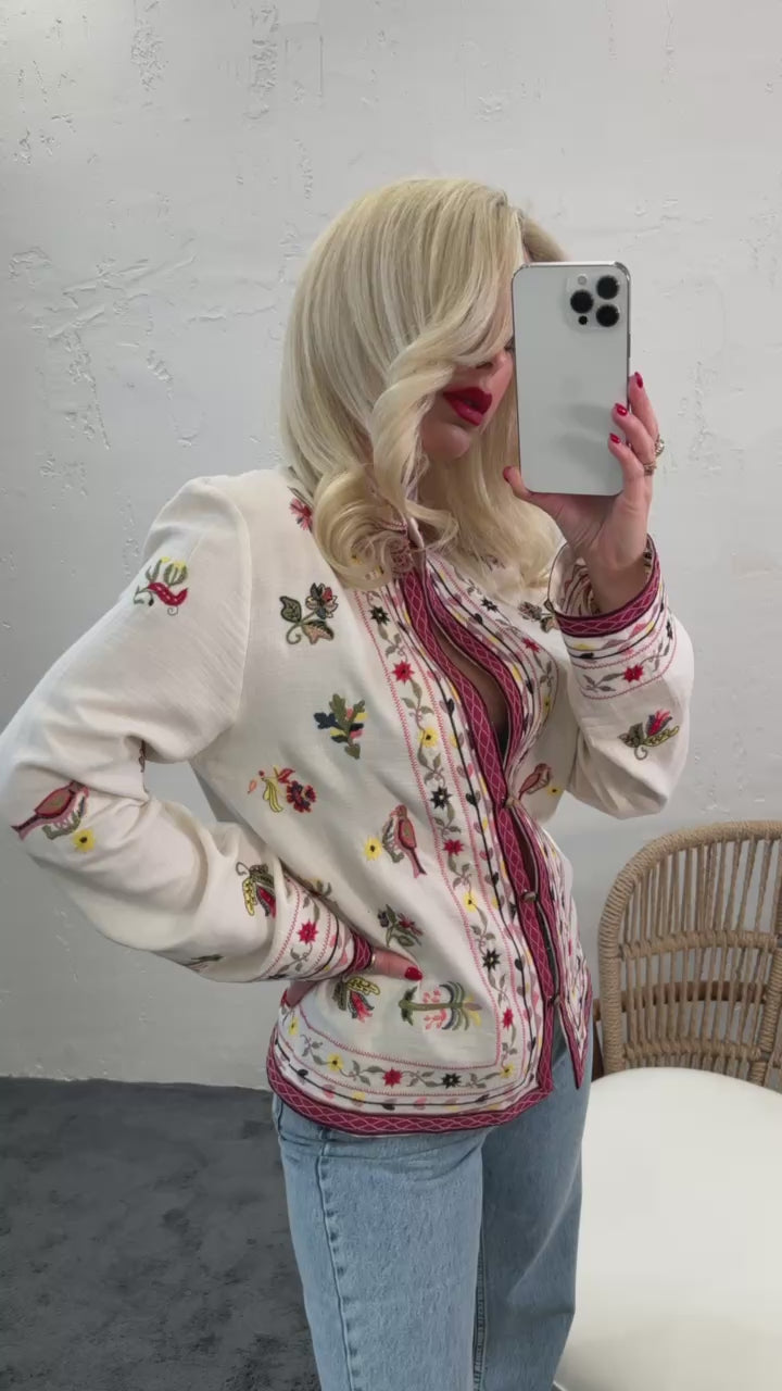 Natural Beige Hip-length Long Sleeve Linen Shirt With Mixed Embroidery