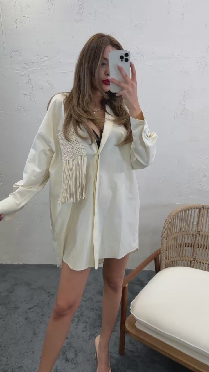 Oversized Button Down Shirt With Fringe Detail In Ecru