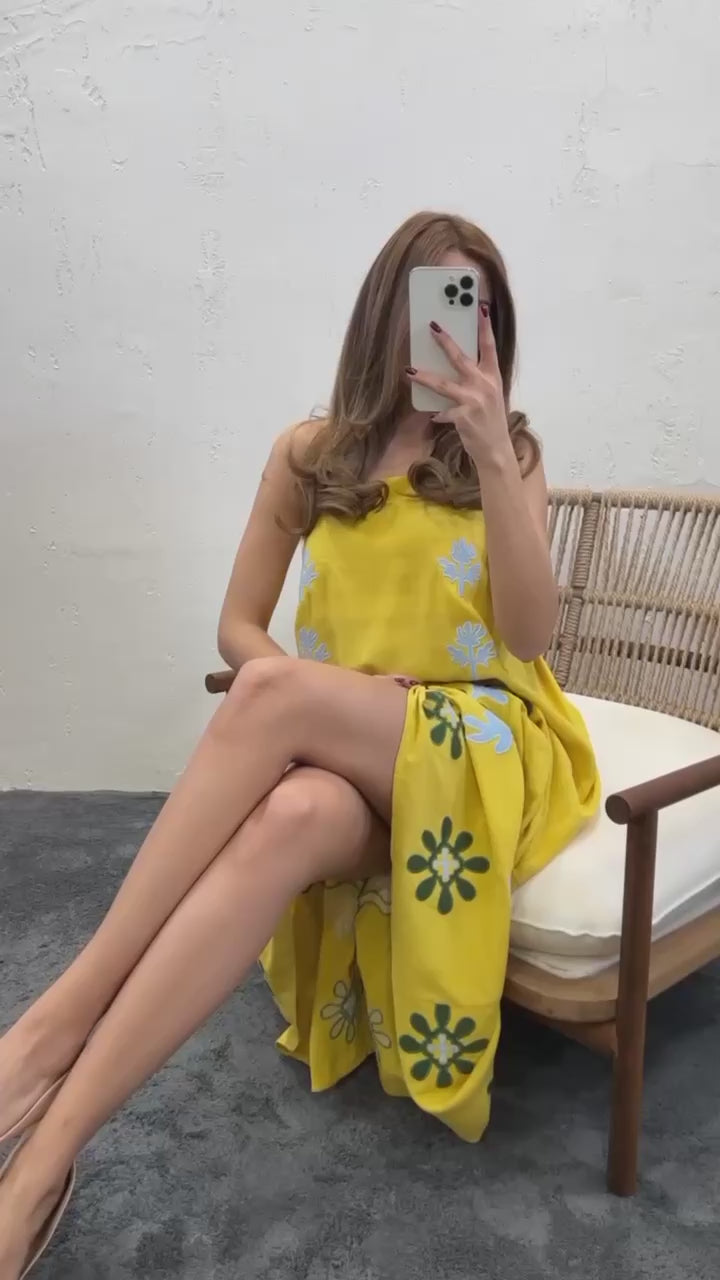 Square Neck Strappy Floral Embroidered Midi Dress In Yellow